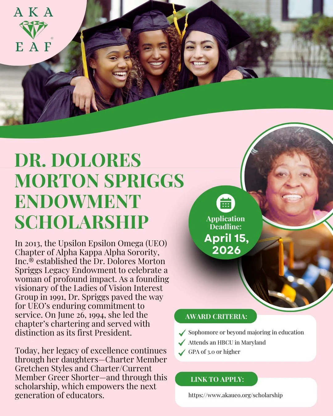 UEO’s Scholarship Program is designed to help offset some of the educational expenses and the financial burden associated with college attendance. This year, we will offer two scholarships: the UEO Family Scholarship and the Dr. Dolores Morton Spriggs Legacy Endowment.